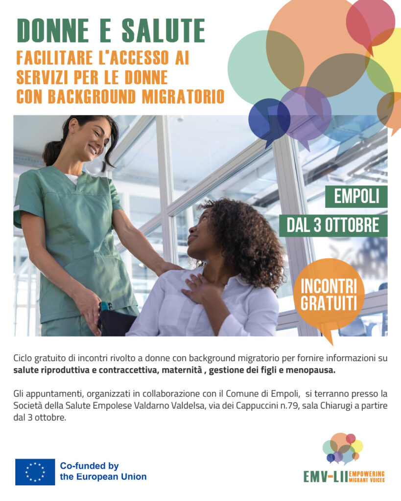 Questo ciclo gratuito di quattro incontri da tre ore ciascuno è rivolto a donne con background migratorio ed ha i seguenti obiettivi: fornire informazioni e conoscenze su tematiche specifiche e rendere le donne più consapevoli dei propri bisogni; creare un collegamento diretto con i servizi territoriali e accrescere l’accesso ai servizi di base; promuovere la partecipazione delle donne a momenti di condivisione e scambio a livello territoriale.